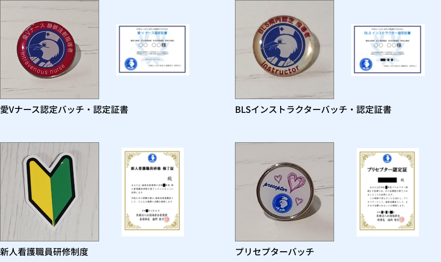 福寿会看護部では、特定の業務に必要な技能及びこれに関する知識について院内認定制度を設け、研修プログラムを修了したものに認定証とバッチを授与しています。今後は、認知症看護や入退院支援など認定制度を増やしていく予定です。