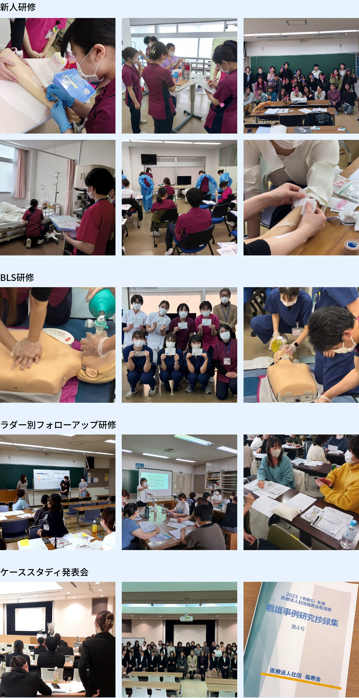 福寿会看護部の主な研修制度は、新人看護職員研修制度・プリセプター制度・看護事例研究研修(ケーススタディ)・ラダー別フォローアップ研修・BLS研修・管理者研修などです。