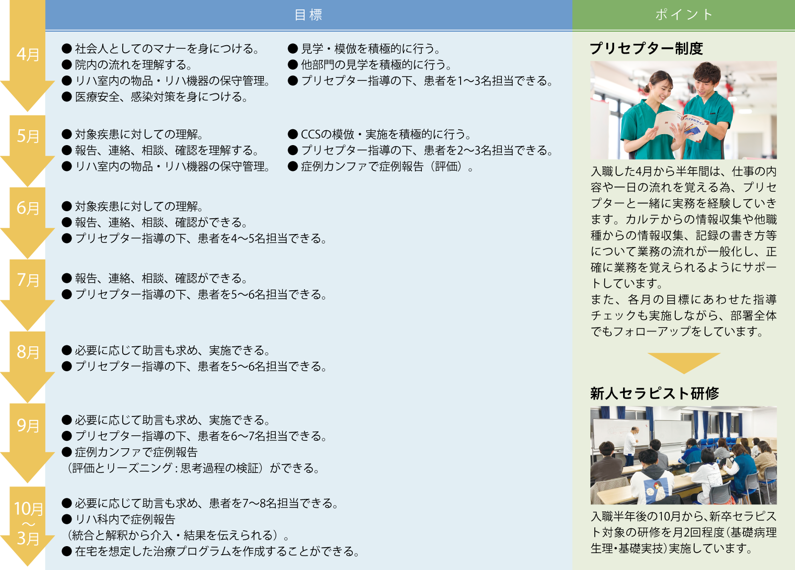入職した4 月から半年間は、仕事の内容や一日の流れを覚える為、プリセプターと一緒に実務を経験していきます。カルテからの情報収集や他職種からの情報収集、記録の書き方等について業務の流れが一般化し、正確に業務を覚えられるようにサポートしています。